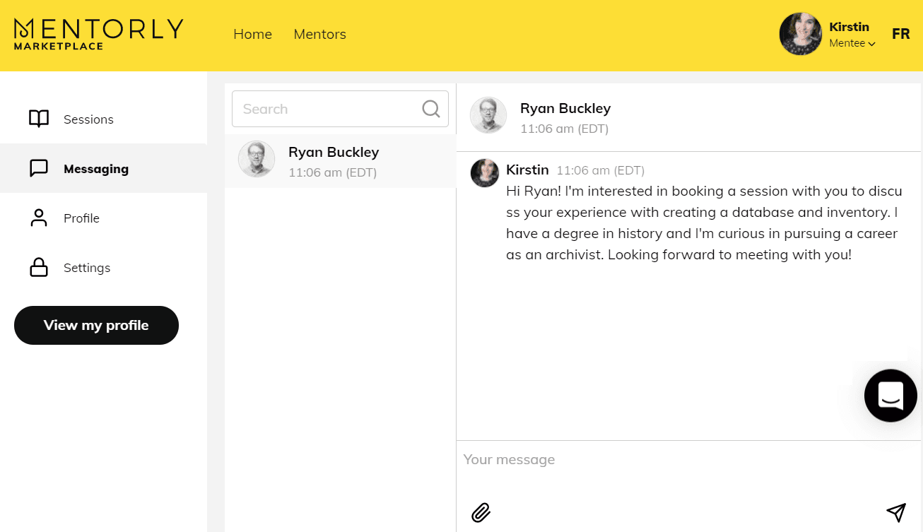 The discussion or message thread with your mentor will be active before, during and after your session. Any messages sent during the video session will be synced to your thread - so all communication will stay in one place!