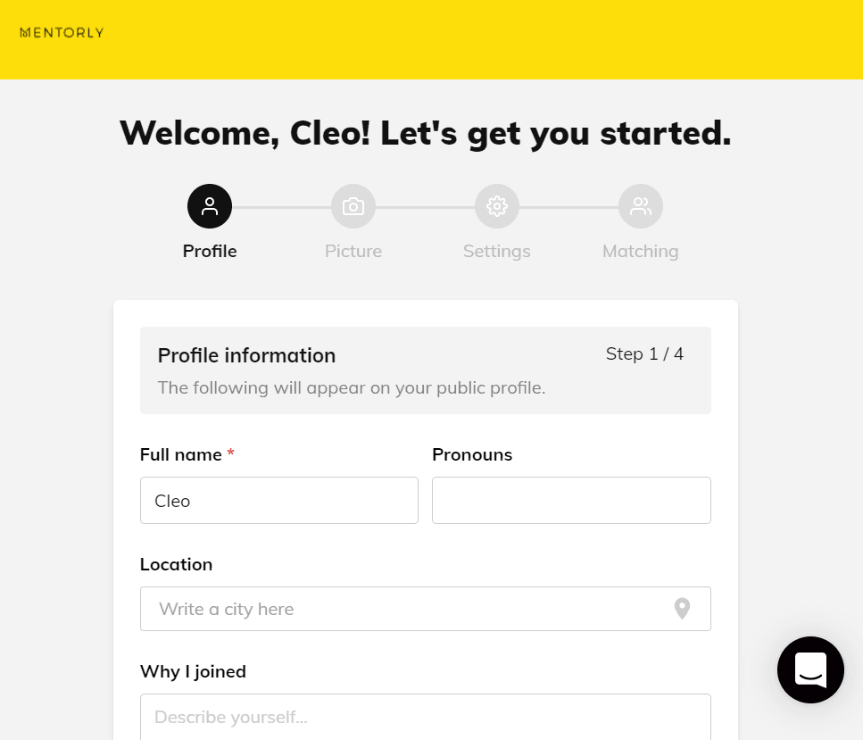 Once you've signed in, Mentorly will guide you through a few Onboarding steps that will allow you to start building your mentor or mentee profile.