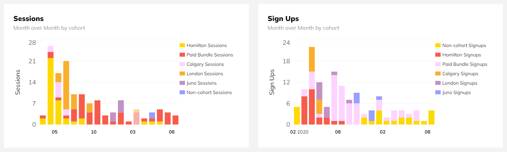 Cohorts have a reporting functionality - this means that the Reporting > Activity tab will break down data per cohort. This is great if you want to compare the amount of sign-ups or sessions per cohort.