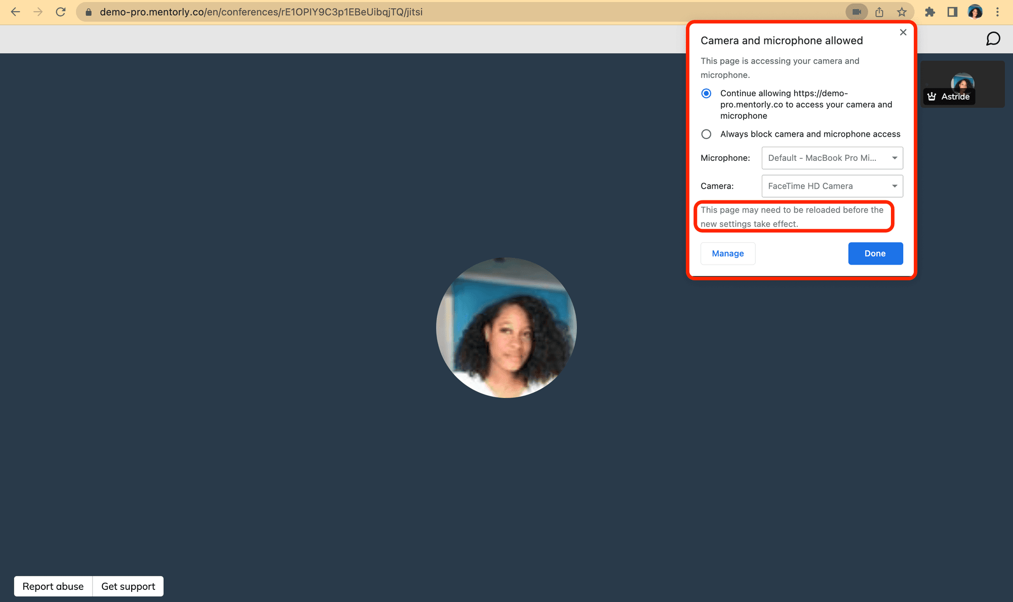 When joining your call, make sure your browser is allowing access to your camera and microphone. If you have multiple devices for your microphone or camera, you can select which to allow from the drop-down menu.