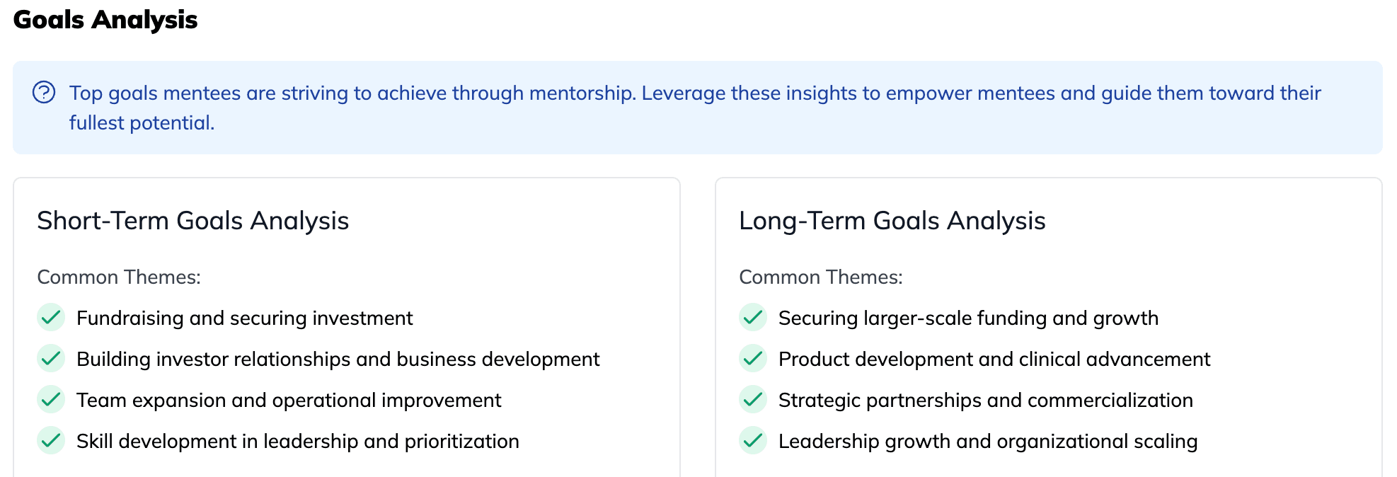 Get a snapshot of the goals mentees are working toward—whether that’s building confidence, improving leadership skills, or navigating career transitions. You’ll also see real quotes from mentees to help bring their goals to life. Use these insights to guide your mentors and shape programming that supports what people truly care about.