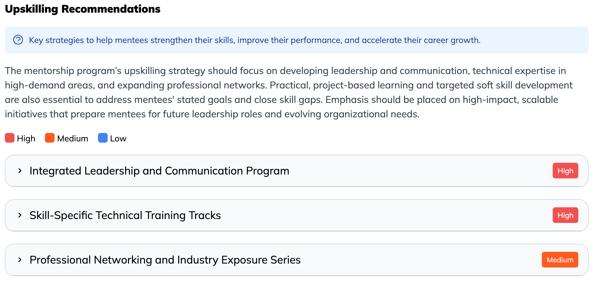 This section uncovers the most common themes and patterns from mentorship conversations. Think of it as a pulse check on what’s top of mind for your participants. You’ll also get actionable recommendations to help your program respond to these insights in meaningful ways.