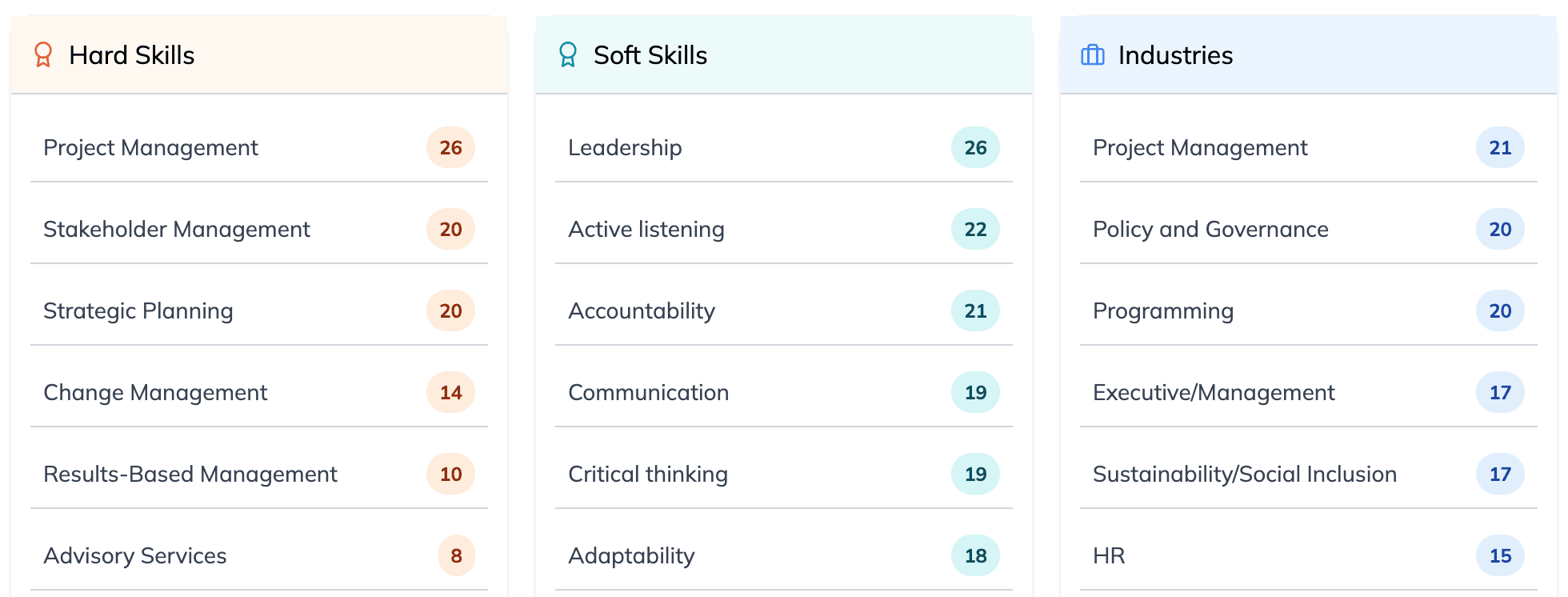 Get a full view of the top skills surfacing across your program—according to both mentors and mentees. This section also outlines the industries represented, helping you understand the professional context your participants are navigating.